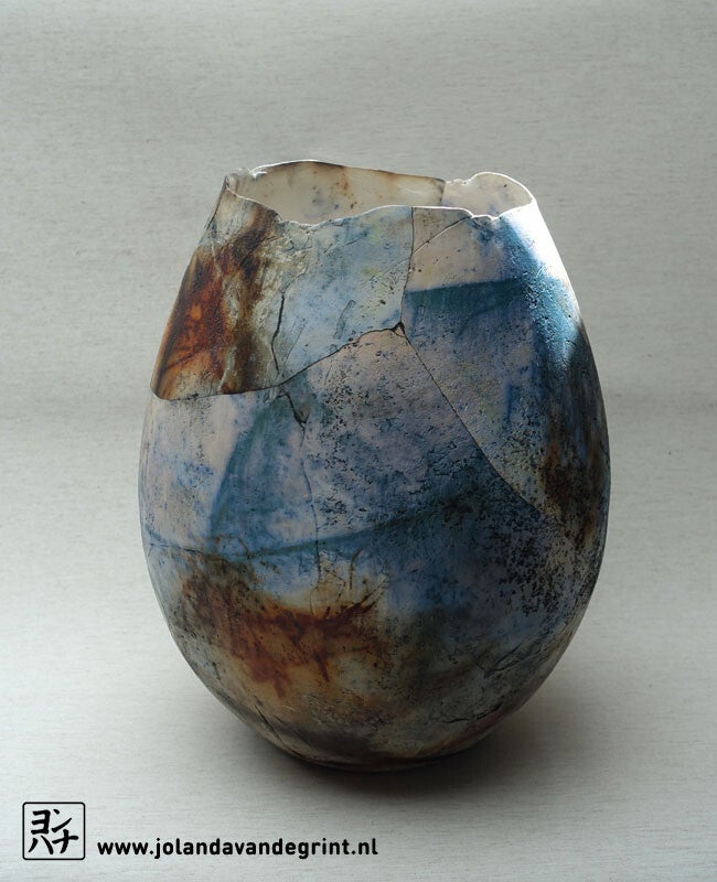 Werk is na de biscuitstook gebroken en de delen zijn apart in de saggar gestookt. Daarna weer in elkaar gezet. 31 cm hoog, 25 cm doorsnede. Het werk is niet geglazuurd en dus niet waterdicht. Kleuren kunnen iets afwijken.